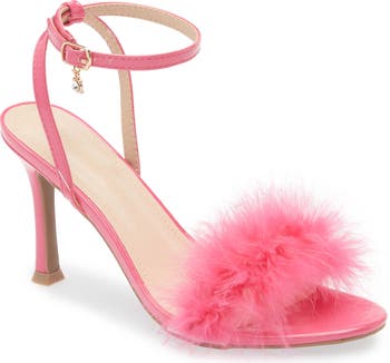 A fluffy faux-fur strap brings opulent texture to the upper of a soirée-ready sandal lofted by a svelte pin heel.