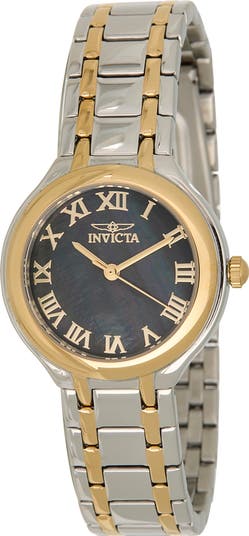 This polished timepiece brightened by a two-tone finish feels light on the wrist thanks to the slim design complemented by its dial centered by Roman numeral markers.