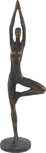 Treat your home with this modern brass polystone abstract yoga sculpture. The distressed brass finish of this yoga sculpture creates a modern appeal that would surely fit in your modern home. The sculpture depicts a standing woman in the tree position which is sure to remind you to detoxify by yoga. This polystone sculpture can be places on any surface and will be suited well in your yoga studio or living room. The gray rectangular base ensures stability contributing your pursuit of inner peace.