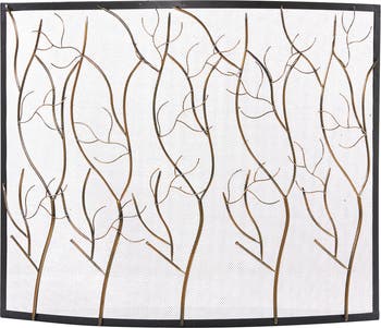 39" X 33" Rustic Reflections curved iron stylized trees and branches fireplace screen, black iron mesh with band frame, cut-out brass-finish curved rod bare trees.