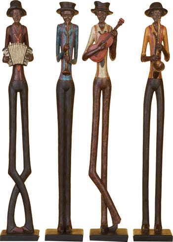 Brown Polystone Tall Long Legged Jazz Band Musician Sculpture with Black Base Stand - Set of 4