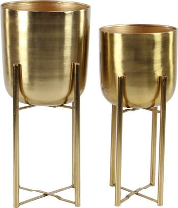 Set of 2 contemporary 19 and 22 inch gold iron planters with stands.