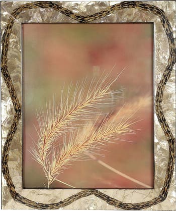 Highlight your most treasured memories or small art prints with this unique multidimensional vervain and capiz shell inlaid picture frame. Handmade with multi-colored vervain and iridescent capiz shells, this large picture frame features a soft velvety backing with easy open arms and an easel back arm to display horizontally or vertically. The contrasting colors and textures make this a beautifully sophisticated and dimensional rectangular photo frame for your rustic style and eclectic decor.