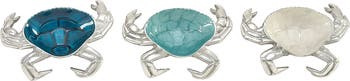 Use this coastal style metal crab dish trio together as other decor containers or individually for small surfaces like a side table centerpiece or on narrow kitchen counters. Use as a serving bowls or as a decor holder on your coffee, console, and kitchen tables for a useful decorative piece. Whether in your kitchen, or on your coffee table, it's a great way to display and store your favorite things. Designed with black rubber stoppers at the base that prevent scratching furniture and table tops, as well as sliding around. This item comes shipped in one carton. Suitable for indoor use only. Made in India. Coastal theme. Designed with a coastal inspired theme for a calming and relaxing vibe. A set of crab dish bowl with very textural shell made of aluminum. This decorative serving dish showcases silver exterior with interior color of white, turquoise and dark blue. This set of dishes features a crab bowl with claws and textural shell base.
