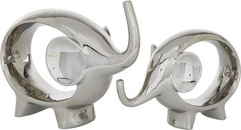 A symbol of good luck, success, and wisdom, these silver ceramic elephant figurines with raised trunks look great wherever you put them. Each elephant features a shiny silver finish and a unique hole in the middle. Display these adorable silver ceramic elephant d cors to add a wow factor to your living room or bedroom. Crafted of ceramic material, these figurines are truly sleek and unique, and will definitely delight an elephant accent collector. A sophisticated sculpture with an antique inspired colors adds dimensions and inspiring mood to any space.