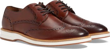 Evoke polished style in a burnished leather derby constructed with a medallion wingtip toe, elegant broguing and a herringbone grip sole.