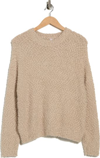 Keep cozy with a pullover sweater knit from bouclé-textured threads and sparkling with a sprinkling of sequins for a festive finish.
