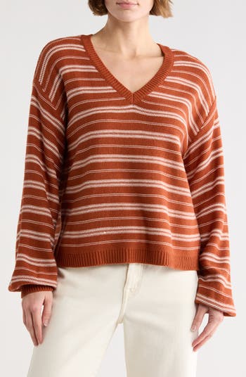 Add a cozy layer to your look with a pullover sweater with a drop-shoulder, bubble-hem sleeve and a stripe pattern.