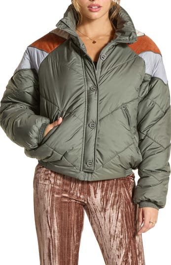 Stay warm in this slouchy puffer jacket constructed with corduroy and contrast chevron stripes for cool retro style.