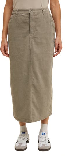 A partial elastic waistband and assortment of pockets deliver practical style to this midi-length skirt cut from supersoft corduroy for cute, comfortable style.