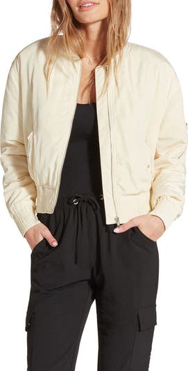 An abbreviated hem gives a trend-forward nod to this classic bomber jacket that's woven from durable fabric for a reliable layer when the temp drops.