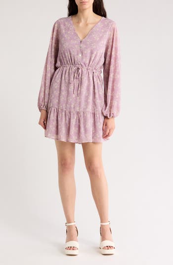 Romantic blooms cover this single-tiered minidress framed with a button half placket and long billowy sleeves.