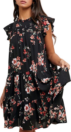 A ruffled neck and fluttery cap sleeves frame this gracefully tiered babydoll dress boasting a whimsical floral print.