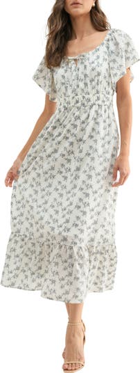 Easily go from the farmers' market to weekend brunch in this midi-length dress framed with flutter sleeves and covered in blooms.
