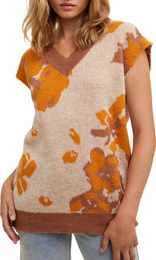 A floral jacquard lends romantic charm to this relaxed-fit sweater vest framed by a contrast V-neck and hem.