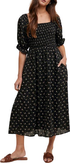 Romantic puff sleeves frame a square-neck midi dress patterned in dainty florals and finished with side-seam pockets.