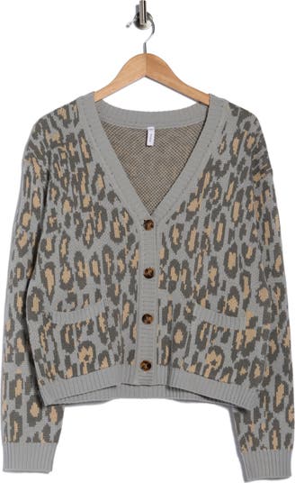Add a dose of wild to your cozy collection with this V-neck cardigan knit with leopard spots.