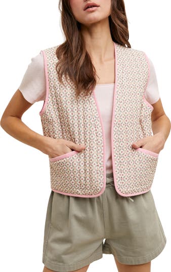 Geometric mosaic printing covers this quilted vest piped with contrast trim and styled with handy pockets.