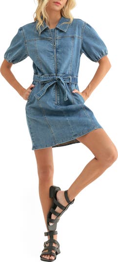 Pretty puff sleeves sweeten a flirty fit-and-flare minidress cut from cotton-blend stretch denim and finished with handy pockets.