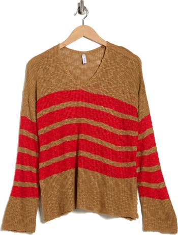 Add a cozy layer to your look with a relaxed long-sleeve knit top featuring a vibrant stripe and airy loose-knit design.