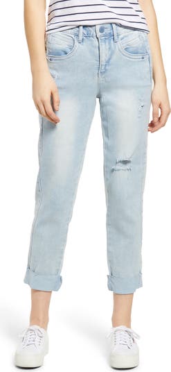 Raw-hem jeans with strategic distressing in a faded wash enhance your shape with 'Ab'solution technology that slims and lifts in all the right places.