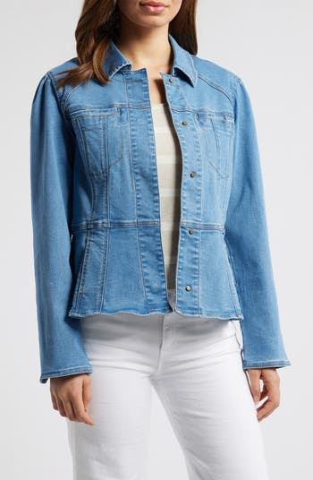 A trusty denim jacket is updated with shapely easy-moving stretch and a flared peplum for an irresistible silhouette.