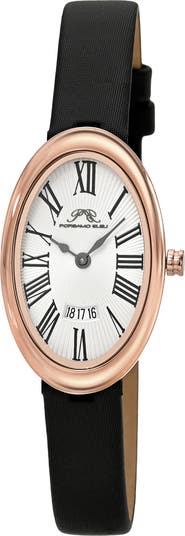 The brand's attention to detail adds their sophisticated touch to a striking leather-strap watch centered by an oval guilloche dial marked with Roman numerals as the indexes.