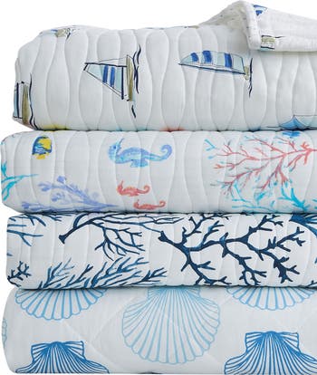 [This review was collected as part of a promotion.] I was gifted this product in exchange for my honest opinion and I actually love this set. It's a lovely reversible pattern in a nuetral color scheme. As shown in my photo, the quilt features a calming under the sea scape on one side and stripes on the other. It is very high quality, even after washing several times. It's light for the warm weather and I can fit in my regular washing machine! I love it and have received compliments on it.