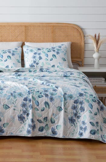 Classic yet charming, this quilt and sham set covered in a watercolor leaves design adds a cozy touch to any bedroom.