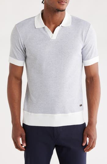 Neutral colorblocking offers easy pairing of a short-sleeve polo knit from soft and stretchy yarn.