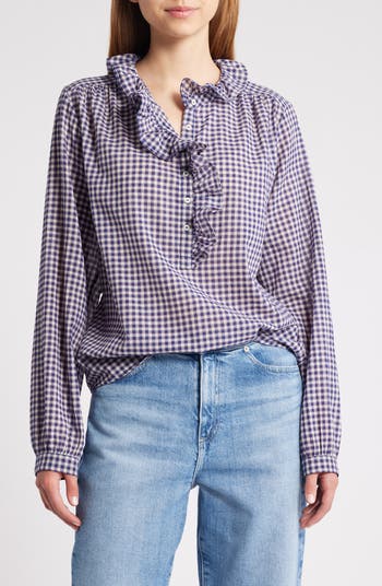 Gingham checks refresh a cotton-rich popover top sweetly accented with a ruffled collar and placket.