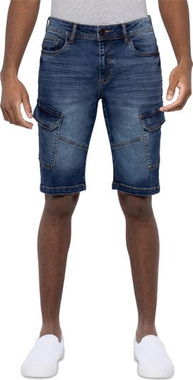 Faded denim brings an old-favorite look and feel to stretch-enhanced denim shorts that are given a utilitarian update with cargo flap-patch pockets.
