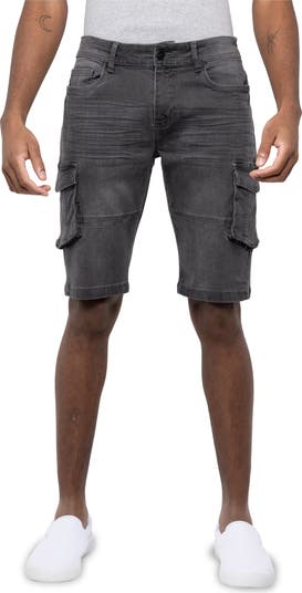 Utility meets street style in these stretch denim shorts featuring whiskering and cargo pockets.