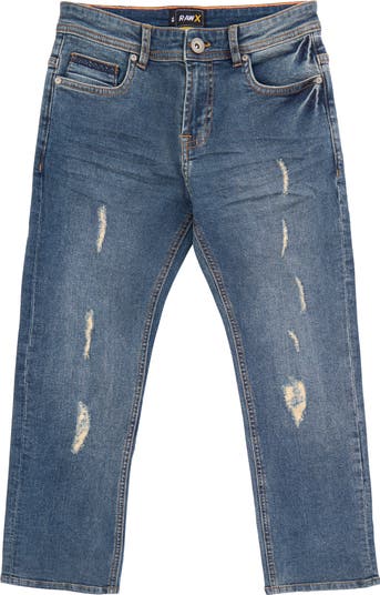 They'll love keeping it low-key in these stretchy denim jeans finished with cool distressing and cuffed hems.