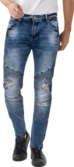 Cool moto-stitched slim jeans constructed from soft stretch denim feature ripped and patched panels for laid-back style.