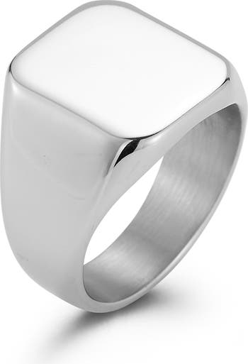 Simple details lend contemporary appeal to a modern signet ring shaped from stainless steel.