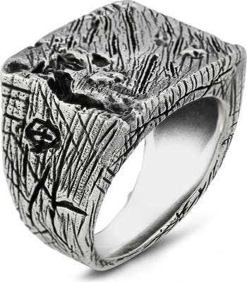 Crafted from oxidized sterling silver, tree bark-inspired textured etching details this signet ring.