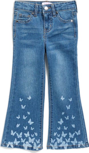Fluttering butterflies add a dose of whimsy to the flared legs of everyday jeans made in a classic mid-blue wash.