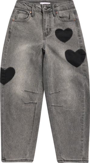 Roomy barrel-leg jeans defined by faded patchwork hearts bring a touch of Y2K style to your kiddo's casual wardrobe.