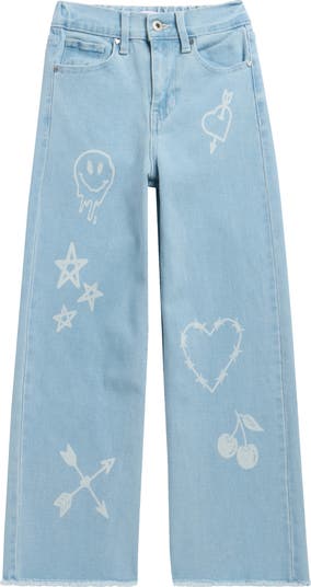 Frayed edges and tattoo-inspired prints further the casual-cool styling of these stretch-kissed jeans cut with a wide leg.
