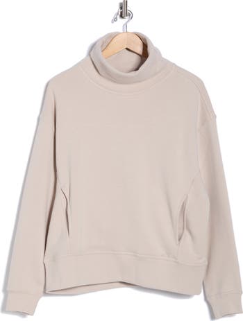 Stay warm on the go in this slouchy fleece pullover sweatshirt framed by a cozy mock neck and handy pockets.