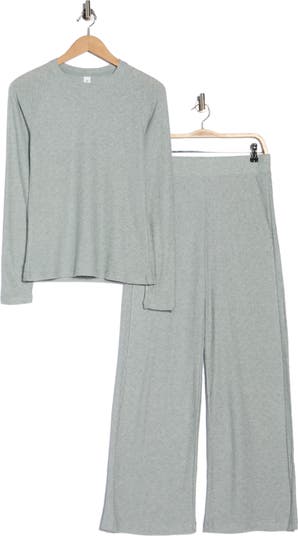 Drift off into dreamland or lounge in comfort with this soft, stretchy set pairing a long-sleeve top and wide-leg pants.
