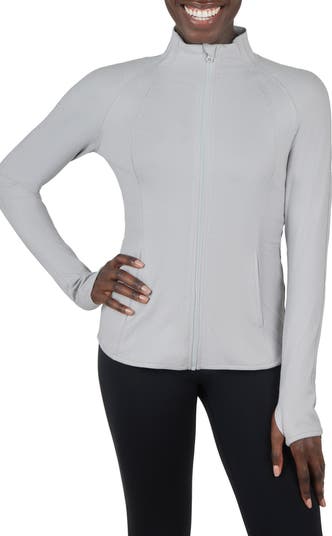Stay warm in this sporty raglan-sleeve jacket fashioned with a cozy stand collar and handy front pockets.
