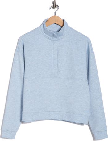 Stay comfortable during your early morning or evening runs in a scuba-knit half-zip pullover cut with dropped shoulders.