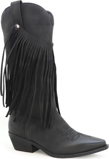 Add country flair to your ensemble in a Western-inspired boot with flowy fringe, pull tabs and a pointed toe.