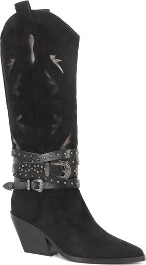Studded wraparound belts amplify the Western appeal of a well-cushioned boot set on a tapered heel.