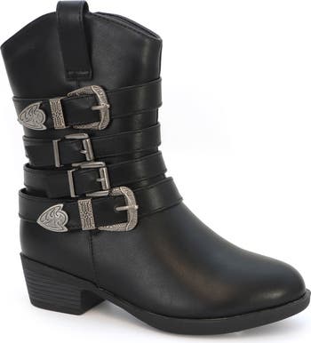A quartet of wraparound belts amplifies the Western appeal of a well-cushioned boot set on a tapered heel.