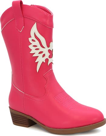 A metallic butterfly appliqué details the front of this Western-inspired faux-leather boot finished with side pull-tabs.