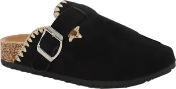 Contrast whipstitching makes a statement at the topline of a faux-suede clog fitted with a cork footbed for all-day comfort.
