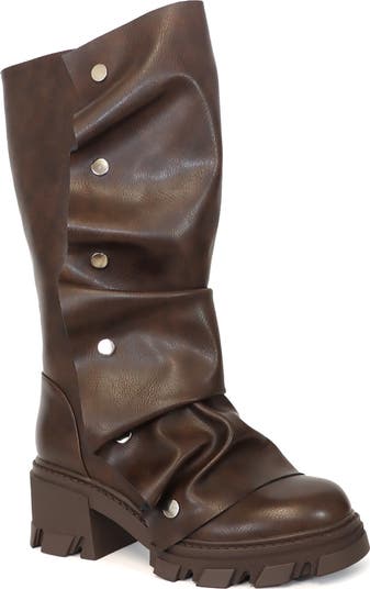 Gleaming studs punctuate the slouchy shaft of a knee-high boot grounded on a chunky heel and toothy lugged sole.